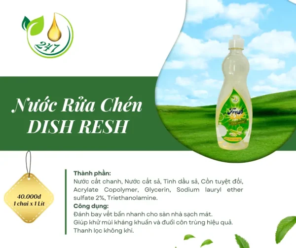 Nước rửa chén Dish Resh 247 với công thức đặc biệt từ thành phần thiên nhiên, giúp làm sạch chén bát, đĩa, dụng cụ ăn uống hiệu quả, an toàn và không gây hại cho sức khỏe. Sản phẩm có hương thơm dễ chịu, không chứa hóa chất độc hại, phù hợp cho gia đình và nhà hàng.
